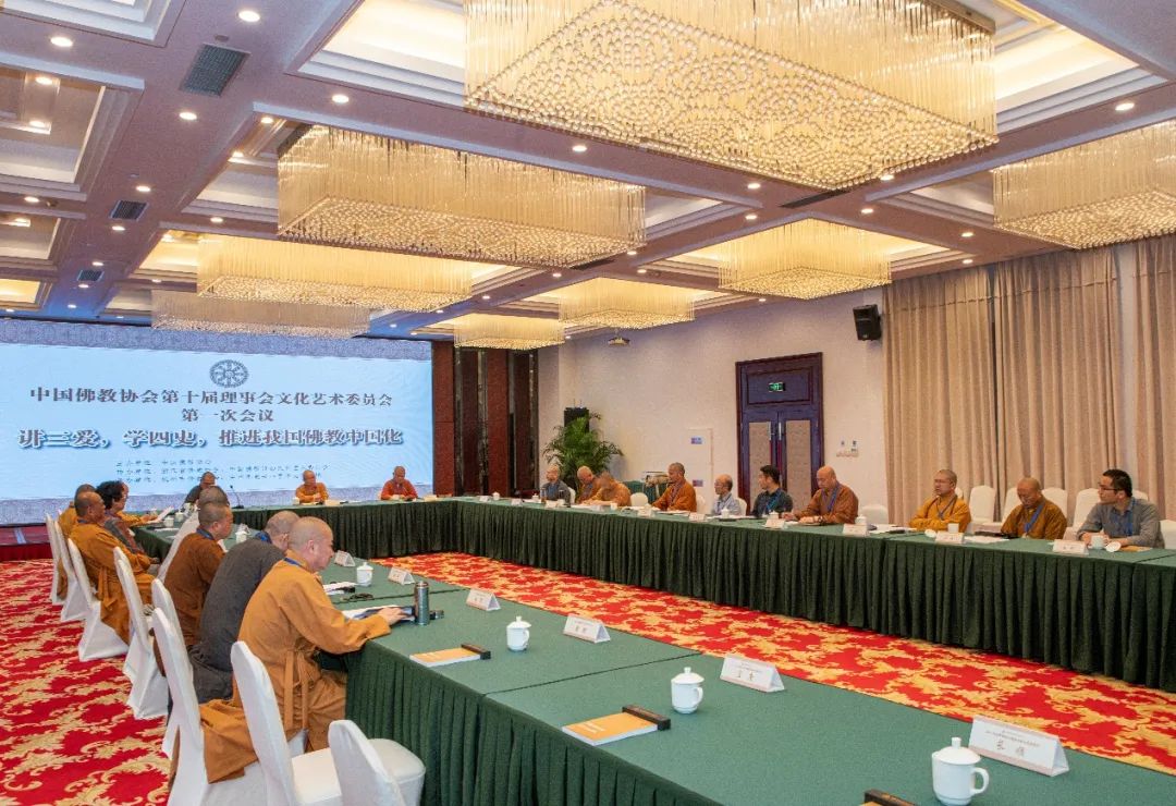 当天下午,中国佛教协会第十届理事会文化艺术委员会第一次会议在杭州六通宾馆举行。委员们对《中国佛教协会第十届理事会文化艺术委员会五年工作计划(2021-2025)》进行了热烈的讨论,并表决通过了五年工作计划。