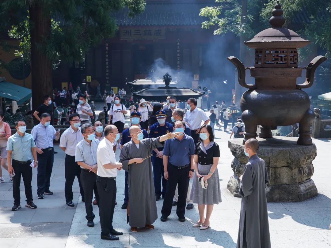 9月27日,杭州市政府丁狄刚副市长,杭州市政府副秘书长程华民,杭州市民宗局副局长唐明壮,市文广旅游局、市卫健委、市应急管理局、市消防救援支队分管负责人等,在灵隐寺方丈光泉法师的陪同下检查灵隐寺消防安全和疫情防控等工作落实情况。