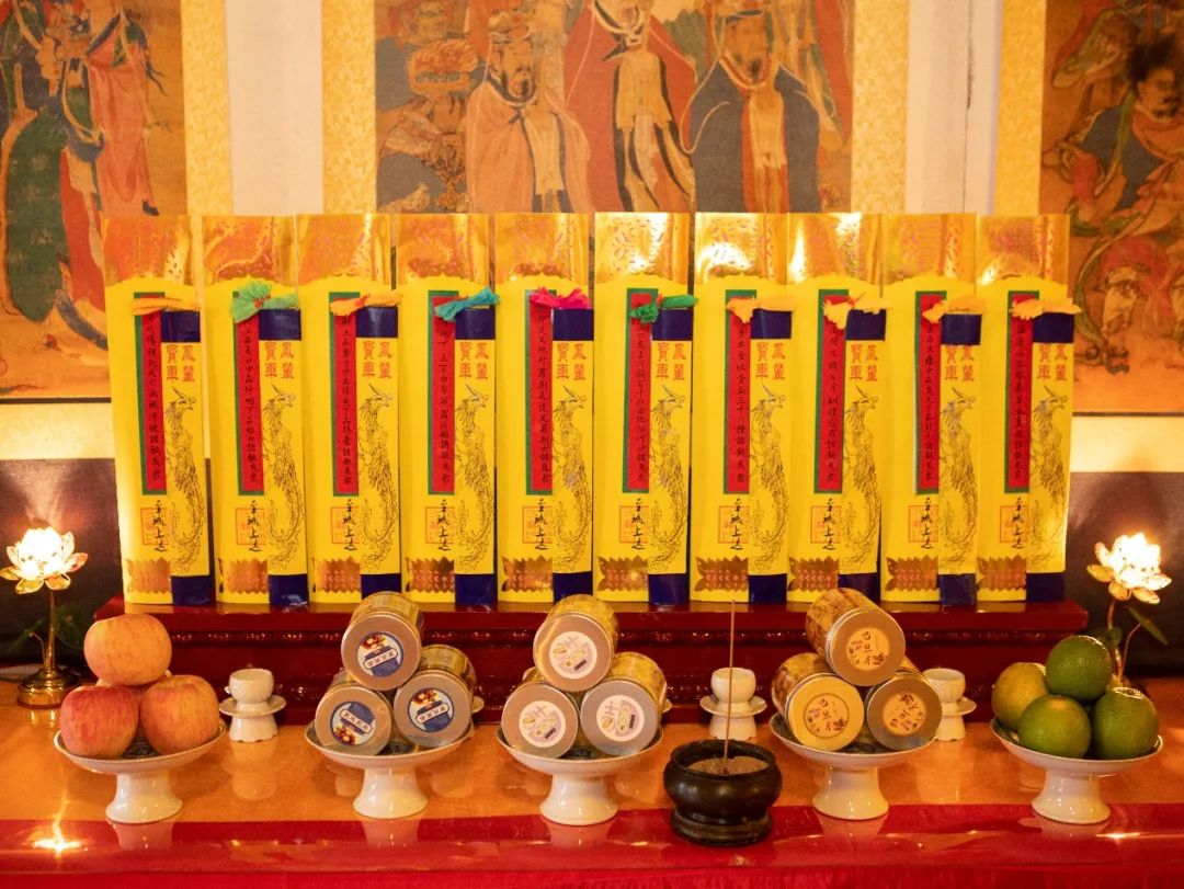 随后,五位金刚上师手指结印、口诵真言、意存观想,加持坛场内种种饮食,以清净甘露法味施予饿鬼道众生,令它们得蒙佛力加持,出离有期。瑜伽焰口法会庄严肃穆,法器和鸣,至晚上10时左右圆满。