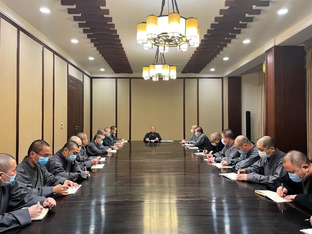2021年12月6日晚上,杭州灵隐寺方丈光泉法师主持召开执事例会,专题学习贯彻党的十九届六中全会、浙江省委十四届十次全会精神,研究贯彻落实举措。