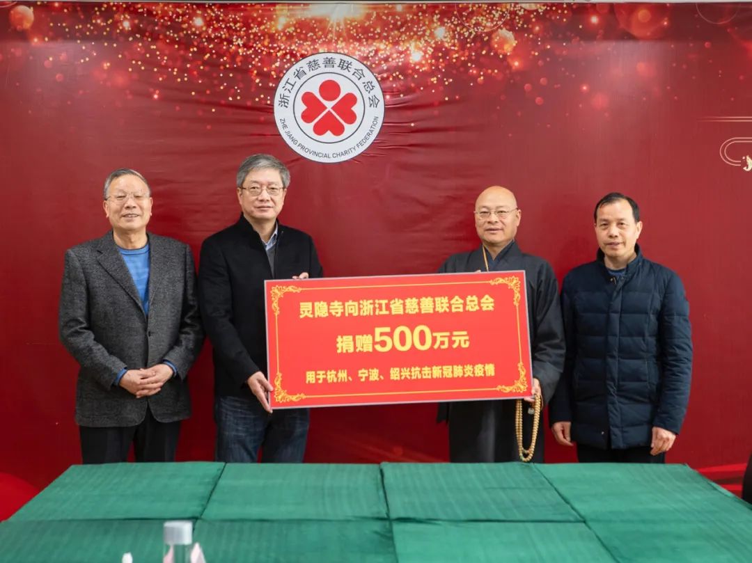 12月20日上午,杭州灵隐寺向浙江省慈善联合总会捐赠善款500万元,用于杭州、宁波、绍兴等地抗击新冠肺炎疫情。