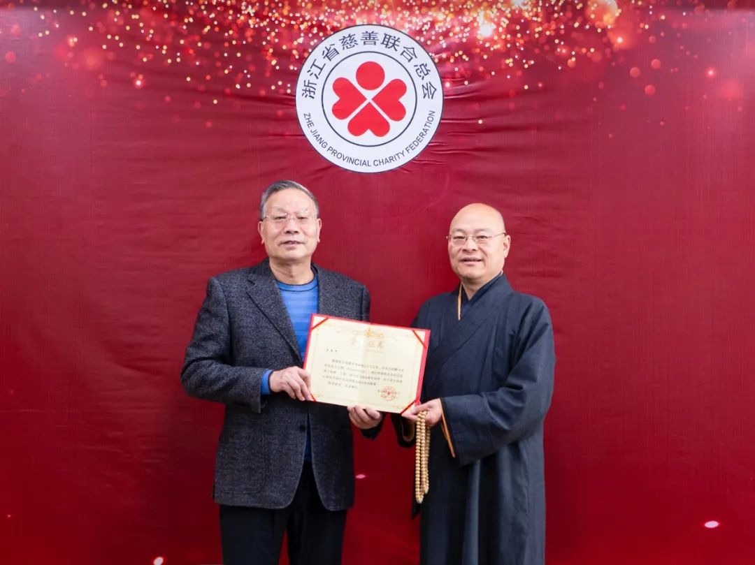 在捐赠仪式上,杭州灵隐寺方丈光泉法师向浙江省慈善联合总会捐赠善款500万元,浙江省慈善联合总会会长陈加元向灵隐寺颁发捐赠证书。
