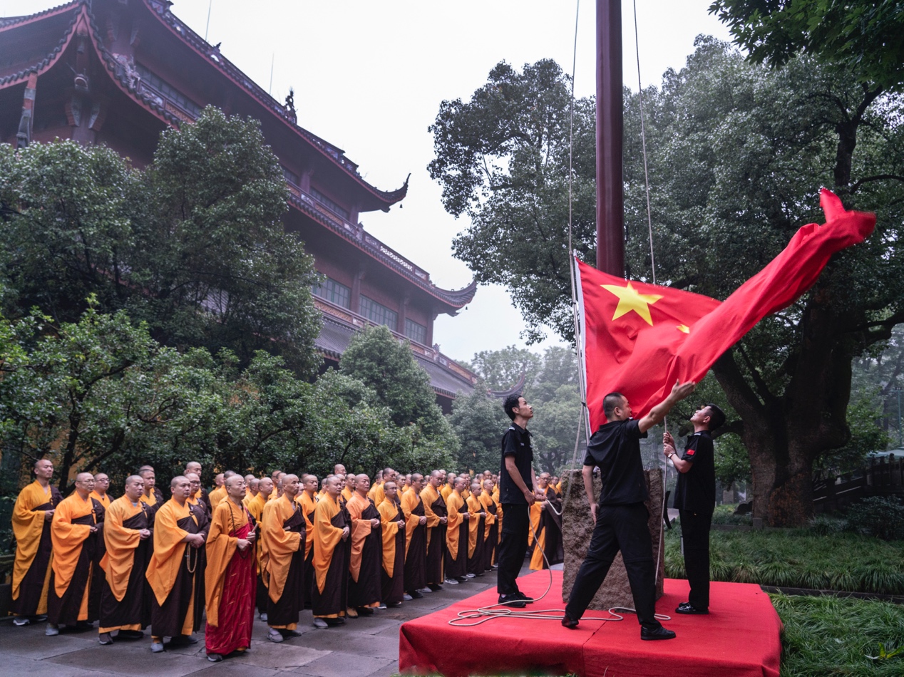 10月1日,中华人民共和国成立72周年,杭州灵隐寺隆重举行升国旗仪式。伴随着雄壮激昂的国歌声,鲜艳的五星红旗冉冉升起,光泉大和尚带领僧众默唱国歌,行注目礼。光泉大和尚对于升国旗的意义作了简短开示:爱国爱教是中国佛教的优良传统,重大的节庆日举行升国旗仪式,是我们每一位出家人,热爱伟大祖国的真挚表达和衷心祝福。