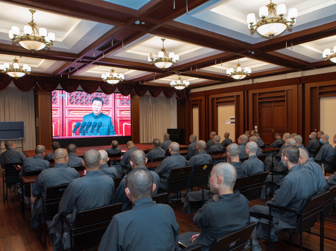 7月1日,庆祝中国共产党成立100周年大会在北京天安门广场隆重举行。灵隐寺组织寺院全体僧众在华严阁集体观看实况直播,认真聆听习近平总书记重要讲话,与全国各族人民一起,共同见证中国共产党的光辉历程,礼赞中国共产党的伟大成就。