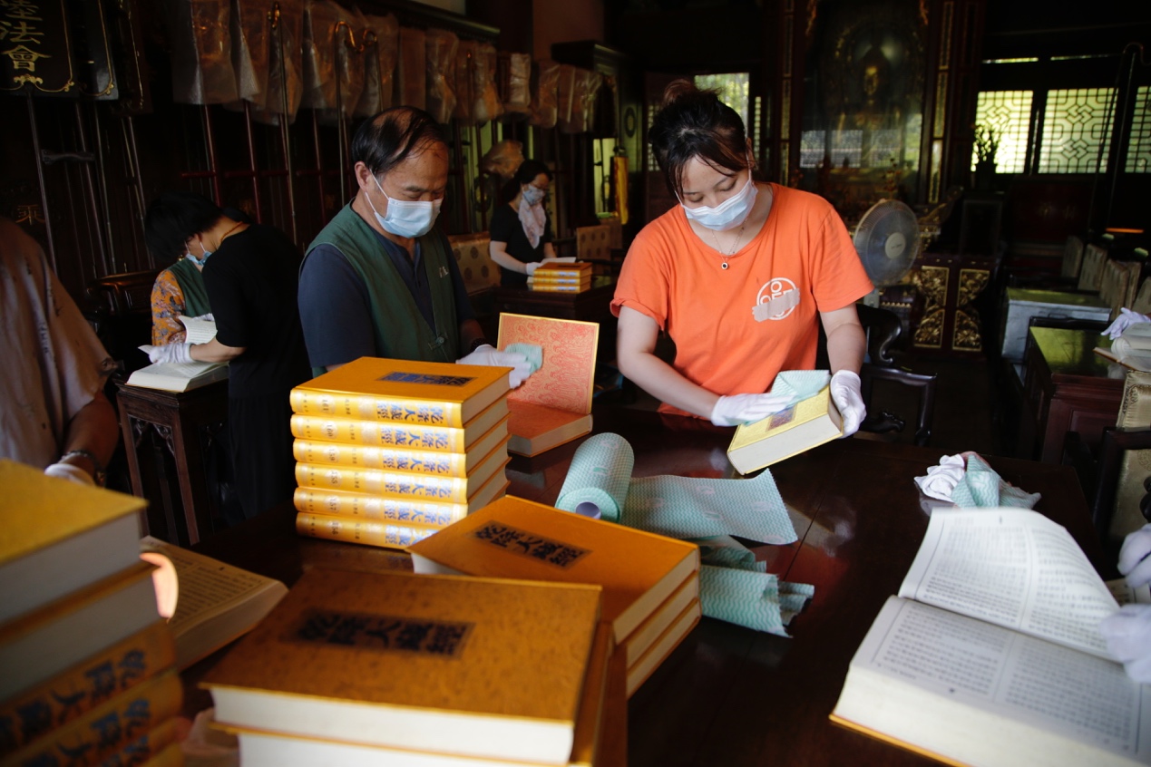 7月中旬至下旬,杭州灵隐寺常住法师组织云林志工于藏经楼翻晒经书。志工们怀着对三藏法宝的景仰之情,沐手焚香,在法师带领和工作人员的配合下,恭敬小心地把珍藏经书请出,细心除去灰尘,并轻轻翻动防止霉变与虫蛀。