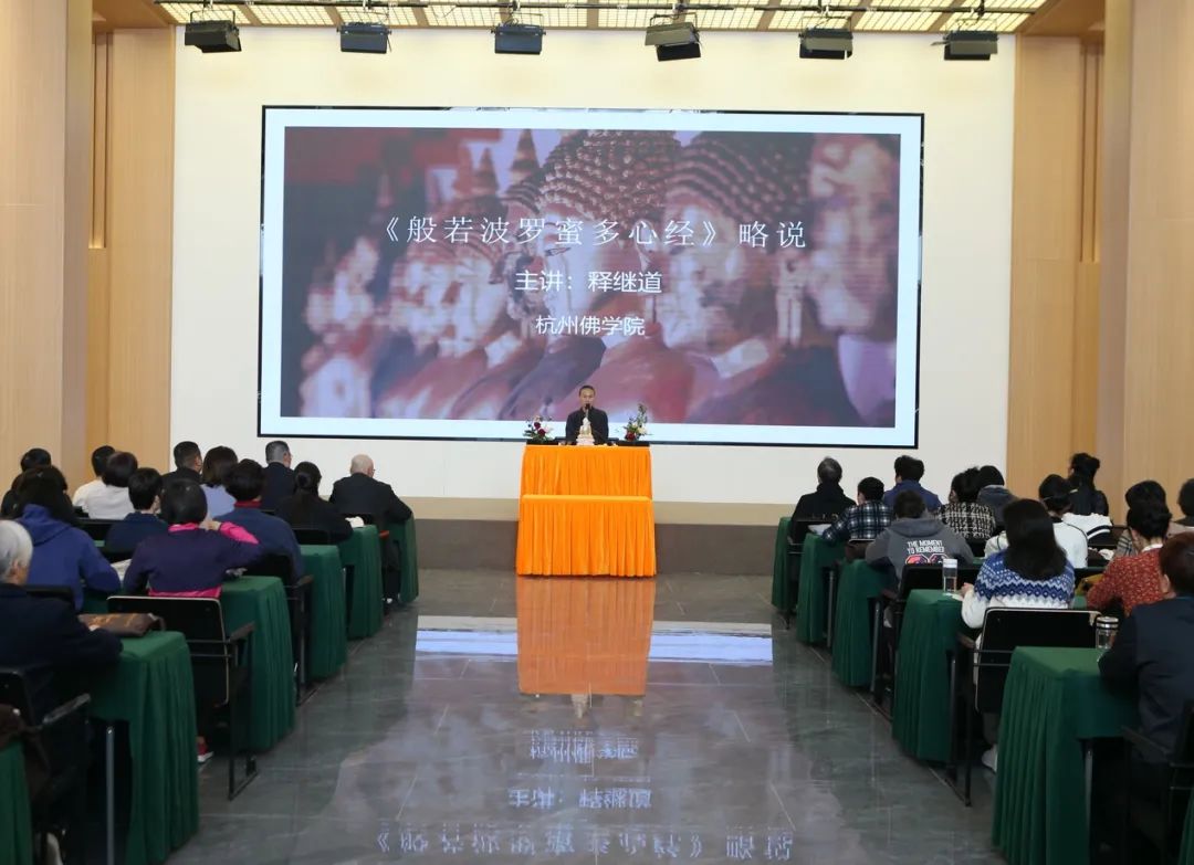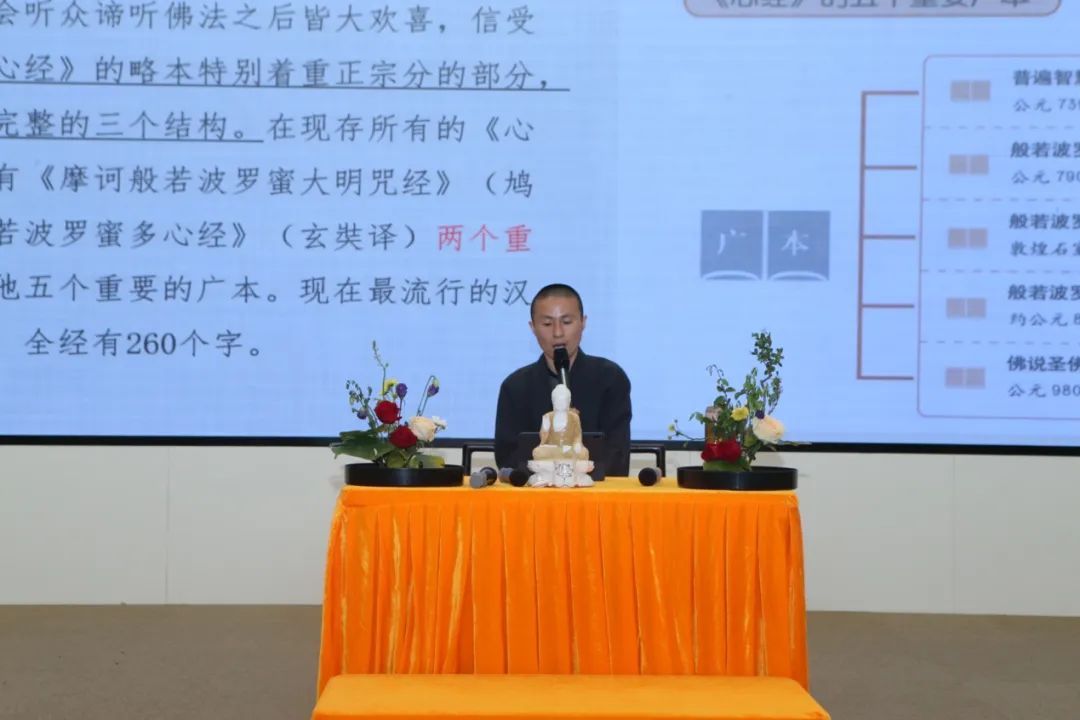 9日上午8点45分,传授八关斋戒法会开始,慧传法师拈香主法。皈依居士在法师的引导下,按照《八关斋戒受持仪轨》,经过迎请、开导、请圣、至诚忏悔、问遮难、三皈依、宣戒相、发誓愿、念佛回向等次第,长跪立誓,纳受戒体。9日下午,继道法师为学员们讲解《心经》。继道法师从《心经》的起源、译本、译者、玄奘法师与《心经》因缘、《心经》详解、《心经》的空性智慧剖析、内容大意、精神、功德利益等多个方面为学员们讲解了《心经》。继道法师强调,《心经》是所有汉译经典中,流传最为广泛的,也是历代高僧大德注疏、讲解最多的一部经典,只有一卷的《心经》被认为是般若类经的提要,言简而义丰,词寡而旨深,并以“处有不有,无心于有有之场;居空不空,不在于空空之境”两句为本次授课做结语。法师的讲解深入浅出,妙语连珠,令学员们饱餐法味。9日晚上,学员们经过一整天的修学活动都已十分疲惫,但大家严格按照八关斋戒的要求,持守“不非时食”戒,过午不食。大家在法师的带领下,一起读诵《观世音菩萨普门品》,借助殊胜庄严的集体诵经,让大家了解到观世音菩萨救七难、解三毒、应二求、普现三十三种应化身,千处祈求千处应,苦海常作渡人舟的事迹,也让大家更加明白,作为佛弟子不仅希求自己能够摆脱烦恼和痛苦,同时也要生起如同观世音菩萨一样悯怜众生的无尽悲心和无边愿力。
