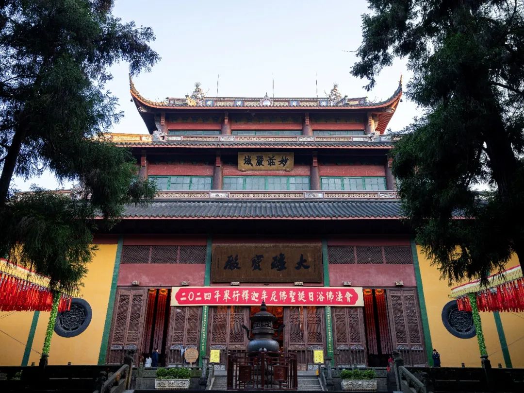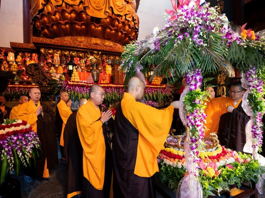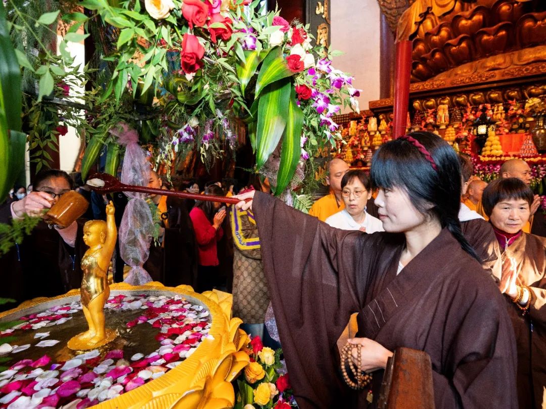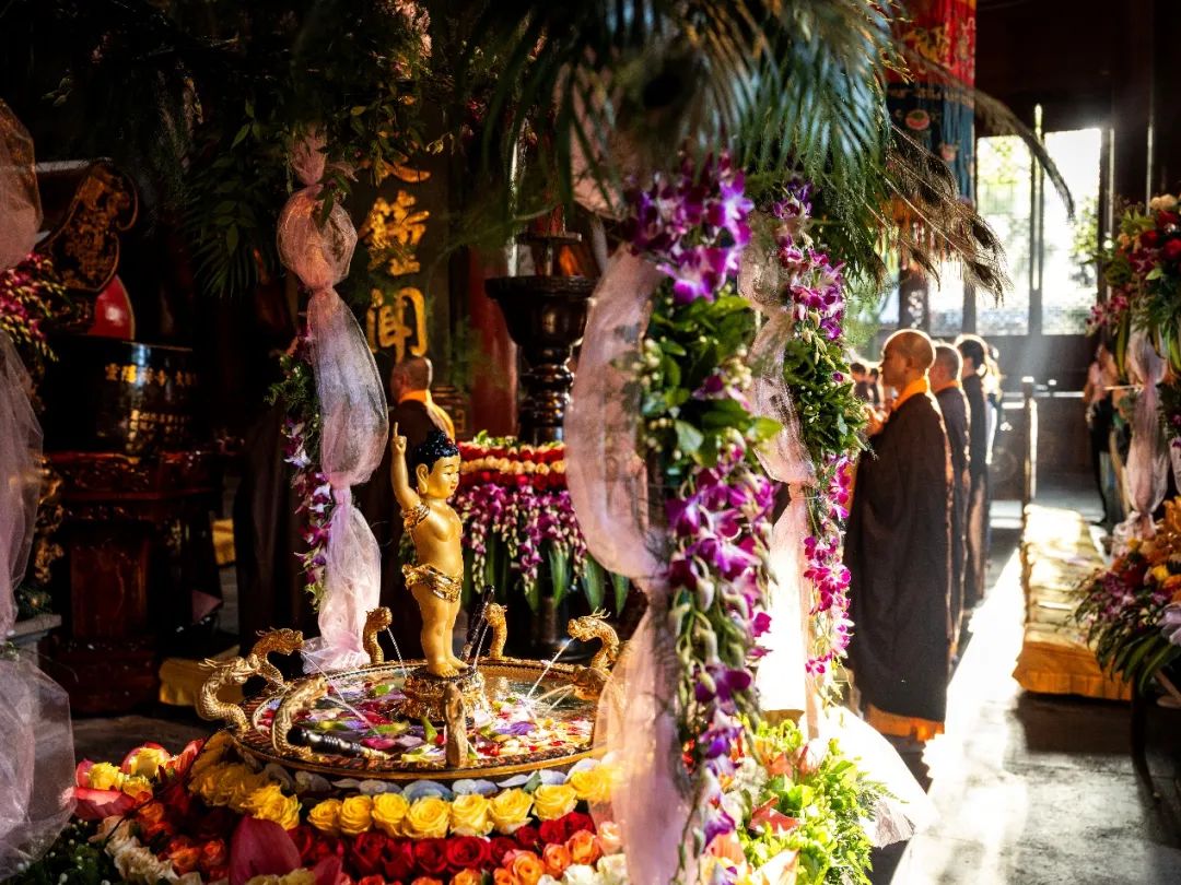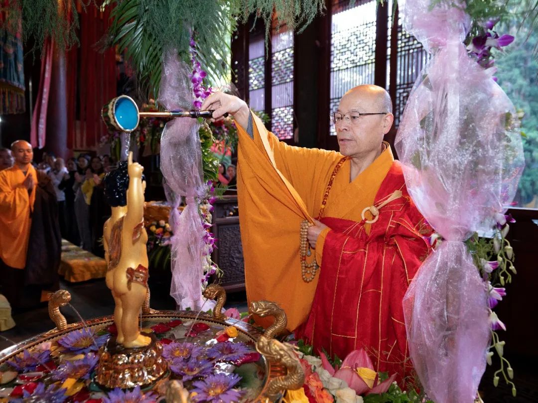 5月15日,甲辰农历四月初八,恭逢释迦牟尼佛圣诞,杭州灵隐寺于清晨举行甲辰佛诞浴佛法会,以此功德回向国运昌隆、正法久住,法界众生永离烦恼尘垢、速证清净法身!凌晨四点四十五分,杭州灵隐寺两序大众搭衣持具,整齐排班,闻磬声向上顶礼三拜后,同声称念“南无本师释迦牟尼佛”圣号,仪仗出班前往客堂,恭迎悉达多太子圣像。灵隐寺方丈光泉大和尚率众恭迎太子像至大雄宝殿,安座于满盛香水的九龙金盆之中。大雄宝殿内经声佛号,梵唱清扬,四众弟子同心感念本师释迦牟尼佛慈航倒驾,降迹娑婆;不恋王宫富贵,直趣雪岭修行,十九学道出家,三十降魔成佛;演经至五千余卷,住世于八十多年,开三乘方便之门,导七趣菩提之路……大众至诚称念“南无本师释迦牟尼佛”圣号,光泉大和尚用小勺舀香汤三勺灌沐太子金身,而后大众分班依次浴佛,共祈国运昌隆,正法久住,世界和平,人民安乐!根据佛经记载,佛陀出生于古印度时,天地大放光明,花雨缤纷,香风四散,九龙吐水,为之沐浴净身;诸天奏乐,为之欢欣庆跃。佛陀踏上大地,足下自然生出莲花,东南西北各行七步,一手指天,一手指地,口自唱言:“天上天下,唯我独尊!三界皆苦,吾当安之!”而后出家修道,成就圣果,击大法鼓,澍大法雨,吹大法螺,树大法幢,利益无边众生!为感念佛陀深恩厚德,庆祝佛诞良辰吉日,后世佛弟子于每年农历四月初八进行浴佛,以纪念佛初诞生时的情景。《浴佛功德经》云:“由作如是浴佛像故,能令汝等人天大众,现受富乐,无病延年;于所愿求,无不遂意;亲友眷属,悉皆安稳;长辞八难,永出苦源;不受女身,速成正觉。”