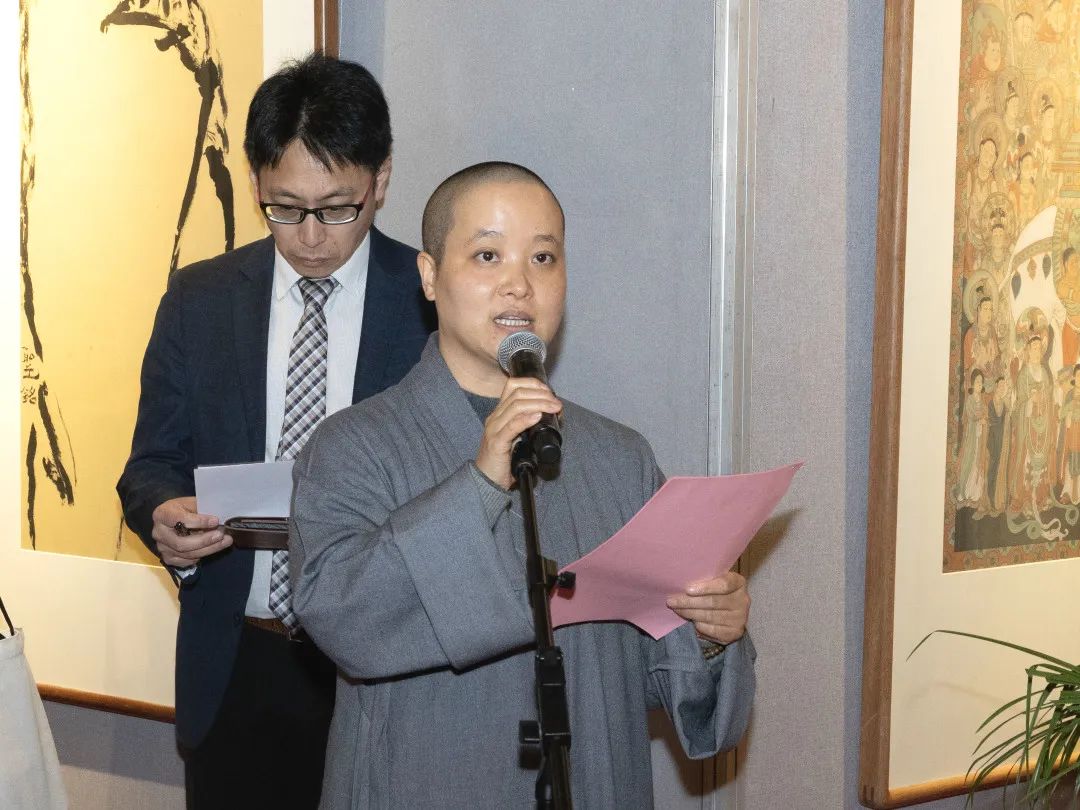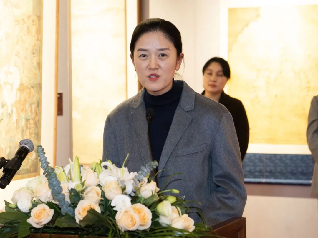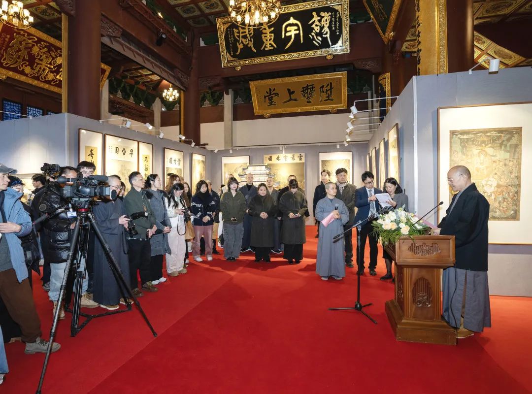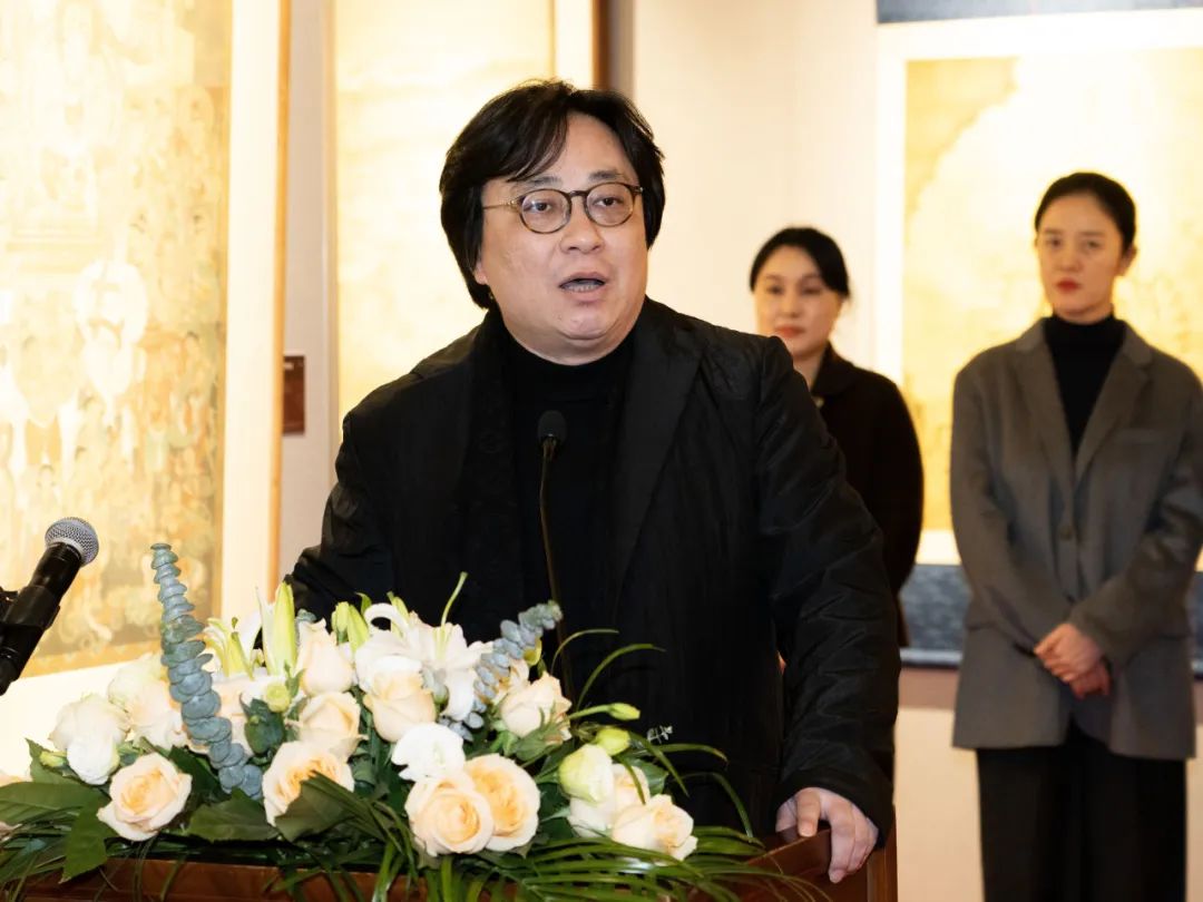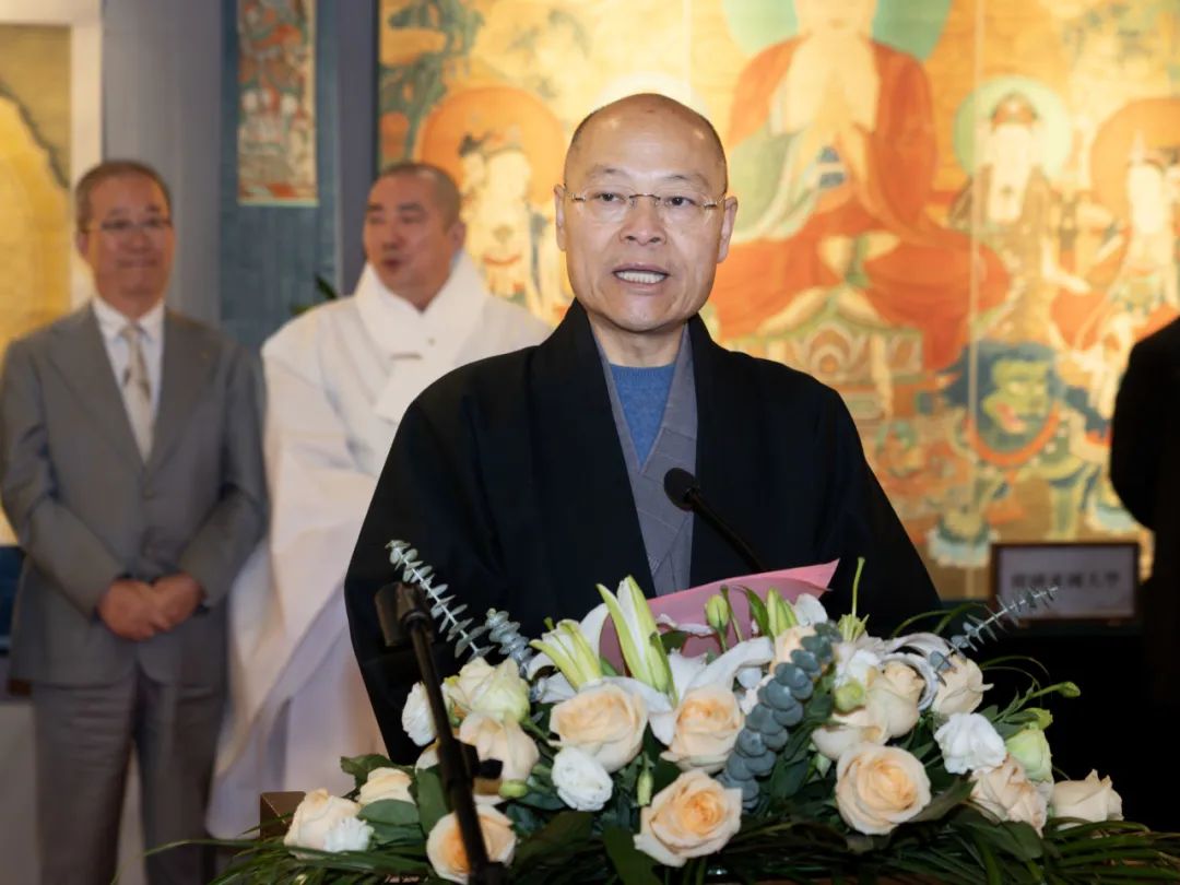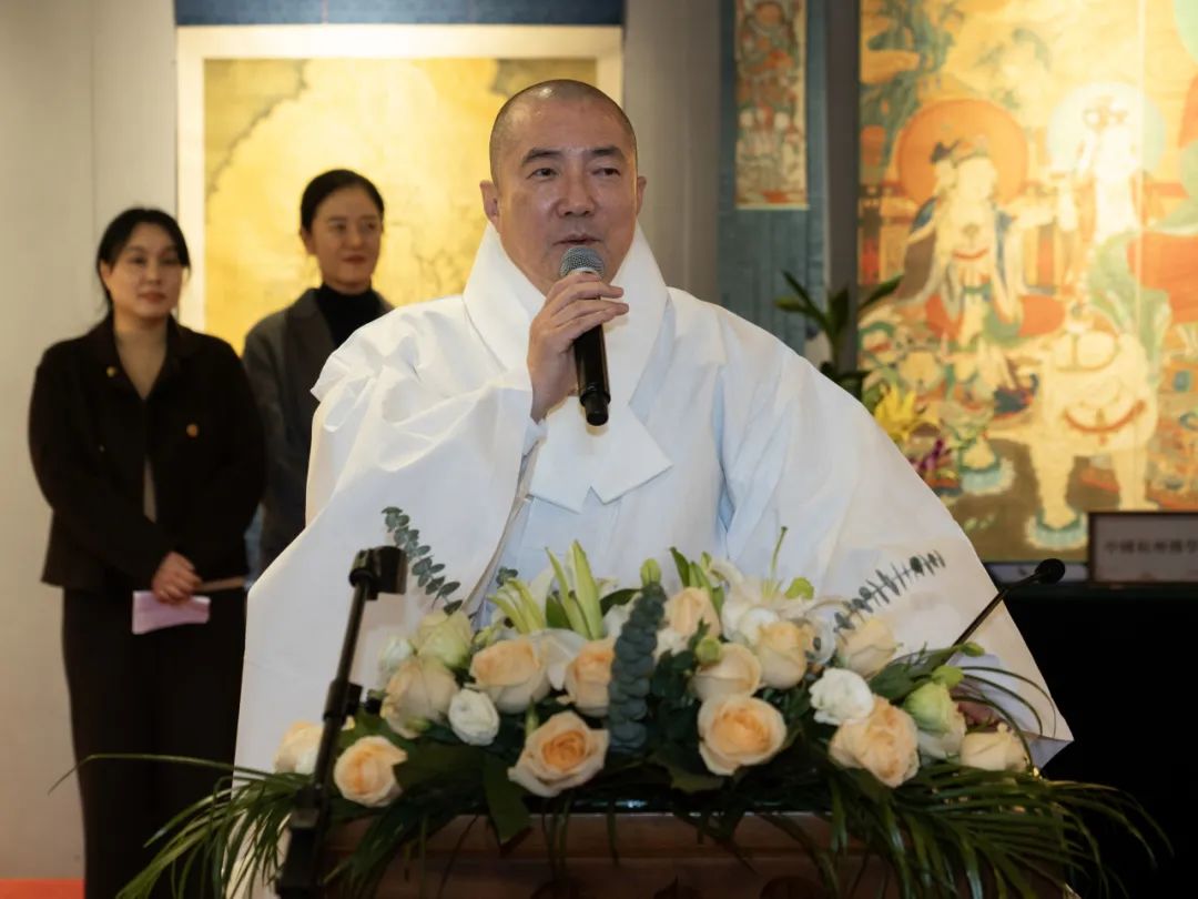 2024年12月31日下午,杭州佛学院与韩国东国大学在杭州灵隐寺直指堂联合举办了“佛法同源”第二届杭州佛学院与韩国东国大学艺术交流暨杭州佛学院艺术院2024届毕业展。出席开幕式的有:浙江省民宗委宗教三处魏微女士、浙江省佛教协会会长、杭州佛学院院长光泉法师、韩国东国大学学校法人理事长顿观法师、韩国东国大学校长尹载雄先生、浙江省佛教协会秘书长金幸祥、杭州市佛教协会副会长圆诠法师、韩国东国大学学校法人事务处长池廷学、韩国东国大学学校法人董事长秘书吴文锡、韩国东国大学校长秘书崔智镕、韩国东国大学国际处中华圈负责人梁惟晶、韩国东国大学美术学科长、主任教授李琇汭、中国美术学院王其全教授、王一飞教授、毛建波教授,以及杭州佛学院师生与东国大学师生一百多人共同参与开幕仪式。开幕式由杭州佛学院副教务长明臻法师主持。本次展览展示了两国传统佛画和现代佛教美术作品等100多幅,展期至2025年1月20日。▲中国美术学院研究生处处长、研工部部长王一飞教授致辞中国美术学院研究生处处长、研工部部长、博士生导师王一飞教授在致辞中表示,此次毕业展体现了十余年杭州佛学院艺术院在学科建设、课程设置、人才培养方面的发展和成果。同时,王一飞教授希望杭州佛学院艺术院进一步增强与韩国东国大学等高校之间的国际交流合作,培养更多的佛教艺术人才。