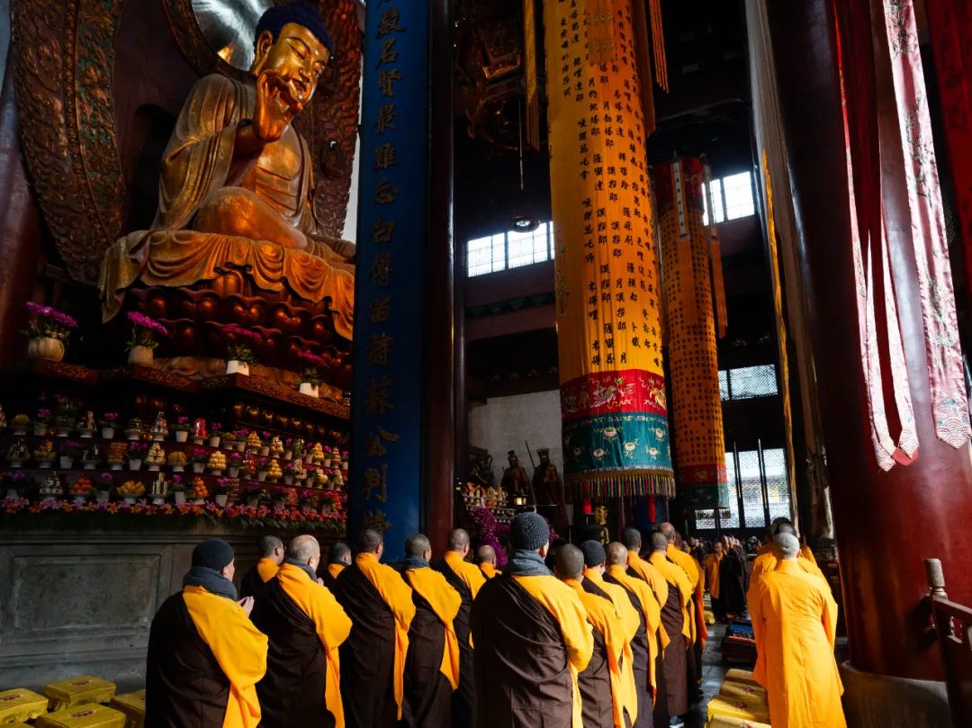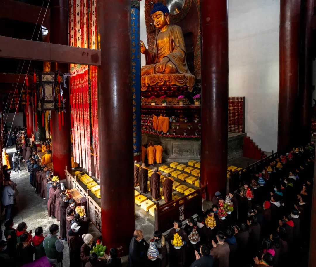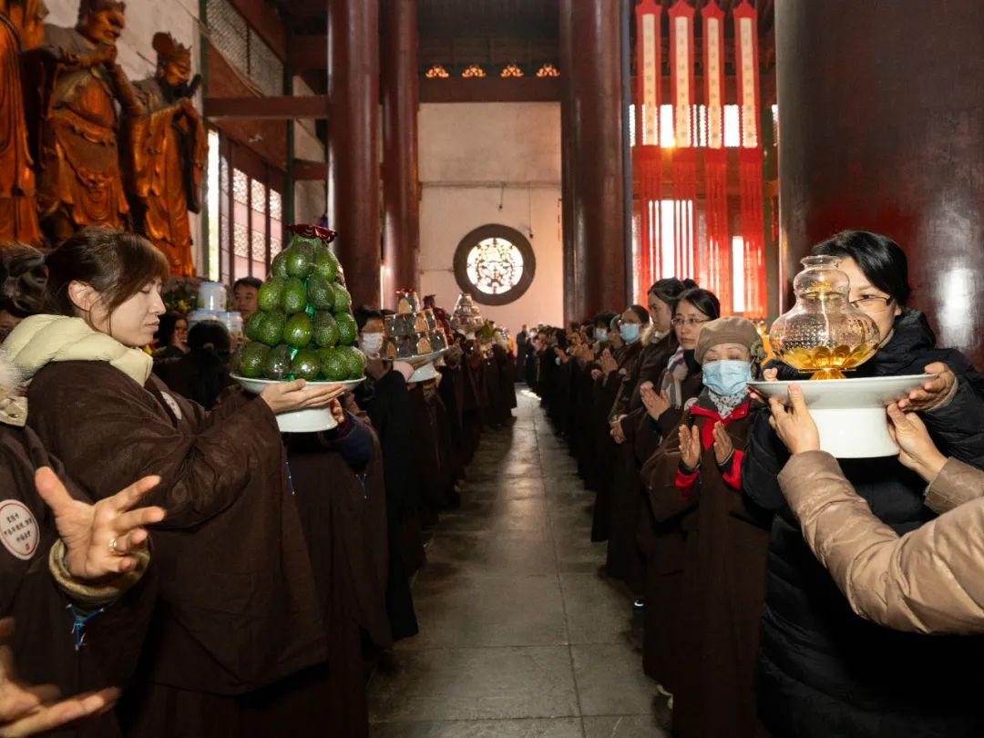 1月7日,甲辰腊月初八,适逢释迦牟尼佛成道纪念日,杭州灵隐寺依照佛教传统,举行甲辰腊八节讲经、传供祈福法会,祈愿雨顺风调,国泰民安,佛道长隆,正法久住。上午十点,传供祈福法会开始,光泉大和尚和智光法师、自愚法师共同主法,四众弟子严整排班,依次传供,谨以香花灯涂茶果珍馐,上酬本师慈荫,所冀法身常住、佛日增辉,一切有情悟无生忍!杭州灵隐寺在腊八当日举行供佛、讲经、施粥等一系列节日活动,上承周秦腊祭习俗遗绪,下启唐宋江南地区腊八节习俗之先,集宗教信仰与世俗观念于一体,是我国腊八节习俗的杰出代表。