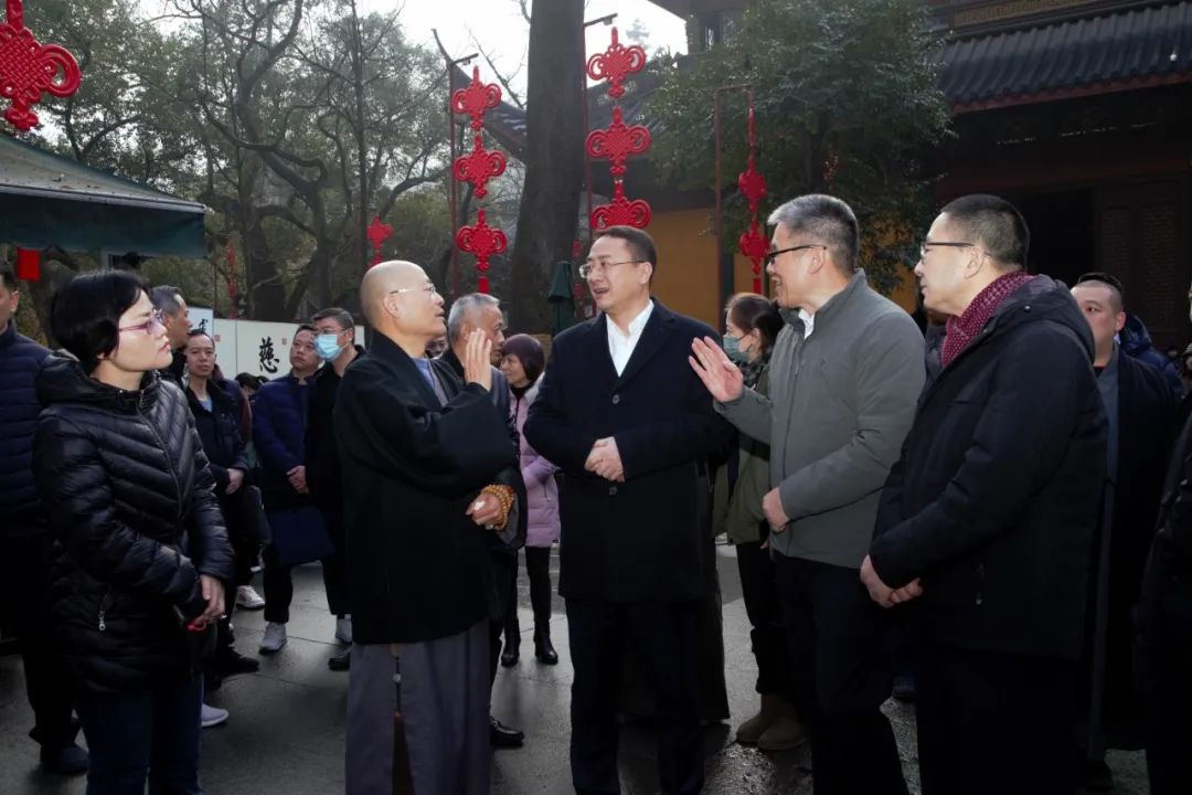 2月2日上午,杭州市委常委、统战部部长朱建明一行赴杭州市佛教协会本部、灵隐寺检查新春祈福活动筹备工作,并召开节前安全工作部署会,省佛协会长光泉法师、市佛协会长月真法师陪同检查。
