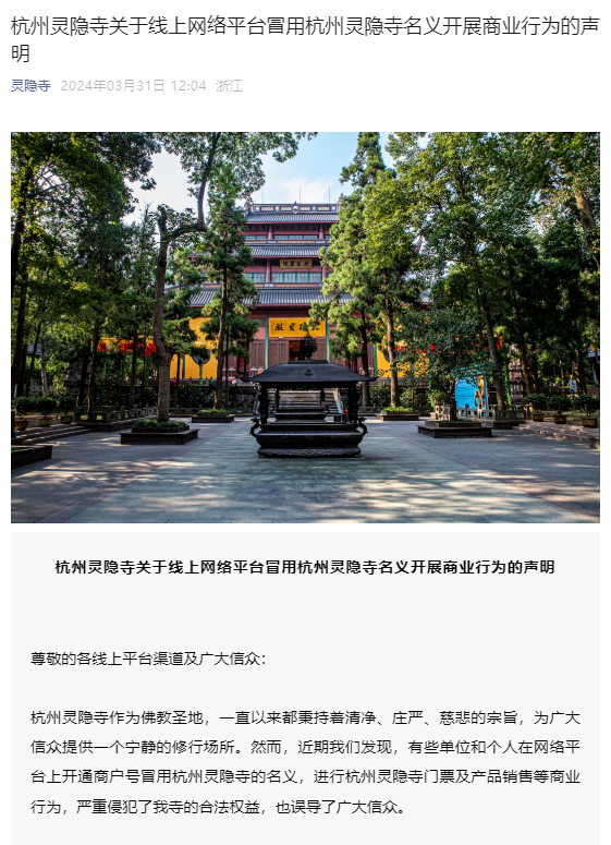 3月31日,杭州灵隐寺发布《关于线上网络平台冒用杭州灵隐寺名义开展商业行为的声明》,表示从未开通或授权任何单位和个人在网络平台开通商户号进行杭州灵隐寺门票及产品销售等商业行为。强烈要求各线上平台渠道立即关闭侵权的商户号,停止一切以杭州灵隐寺名义进行的商业活动,并呼吁广大信众提高警惕,认清真伪,避免受到误导,产生经济损失。