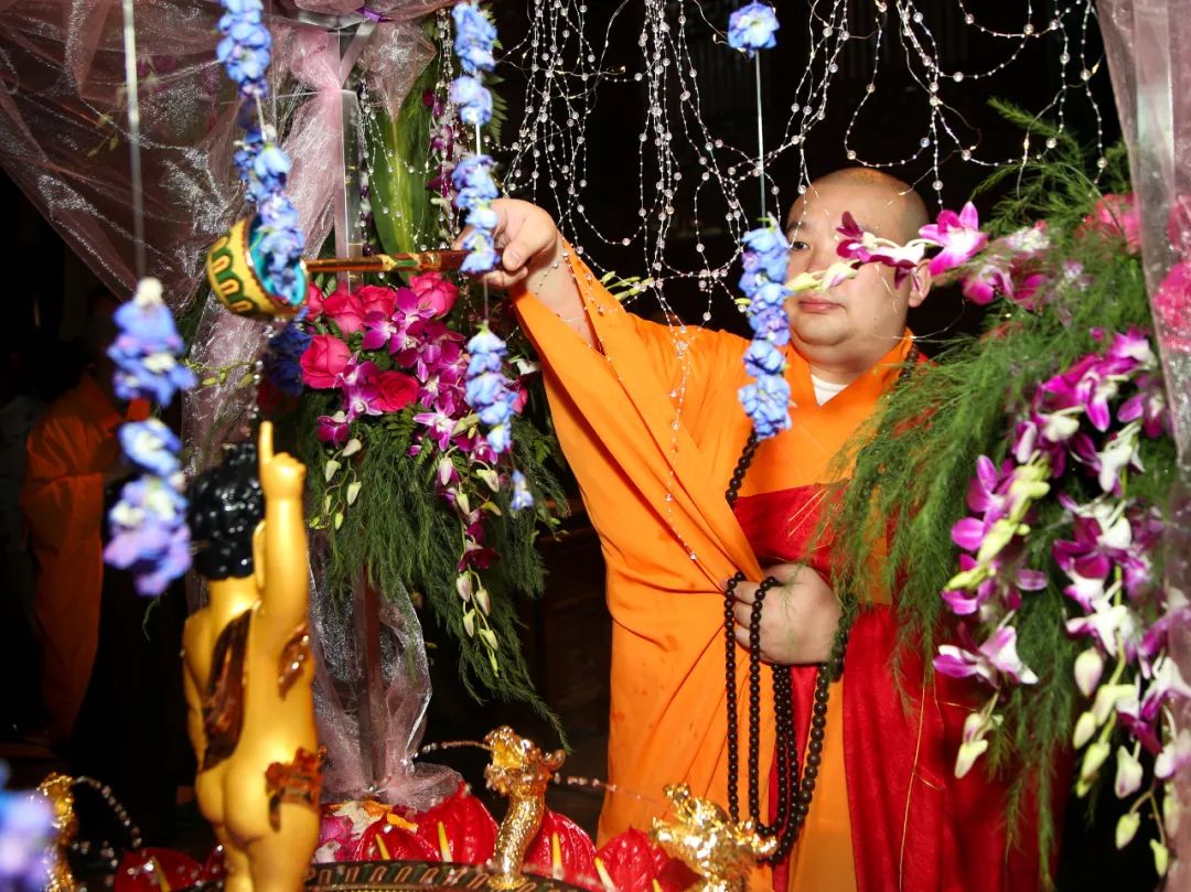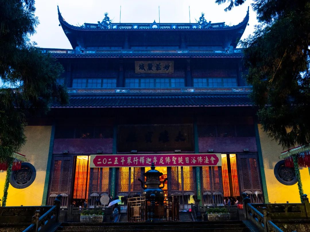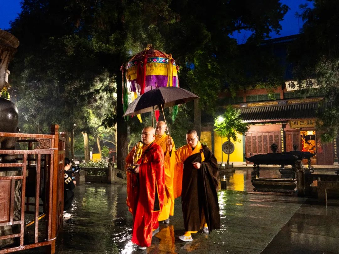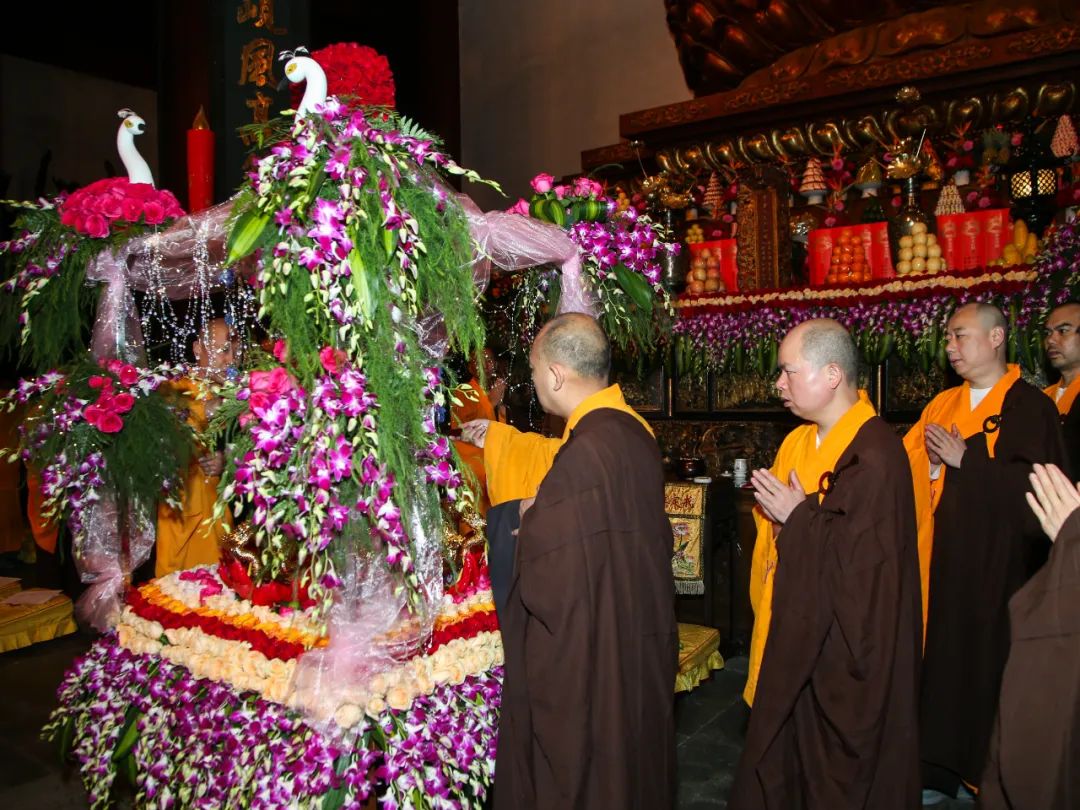 5月5日,乙巳农历四月初八,恭逢释迦牟尼佛圣诞,杭州灵隐寺于清晨举行乙巳佛诞浴佛法会,以此功德回向风调雨顺,国泰民安,佛日增辉,法轮常转。凌晨四点四十五分,杭州灵隐寺两序大众搭衣持具,整齐排班,闻磬声向上顶礼三拜后,同声称念“南无本师释迦牟尼佛”圣号,仪仗出班前往客堂,恭迎悉达多太子圣像,安座于满盛香水的九龙金盆之中。