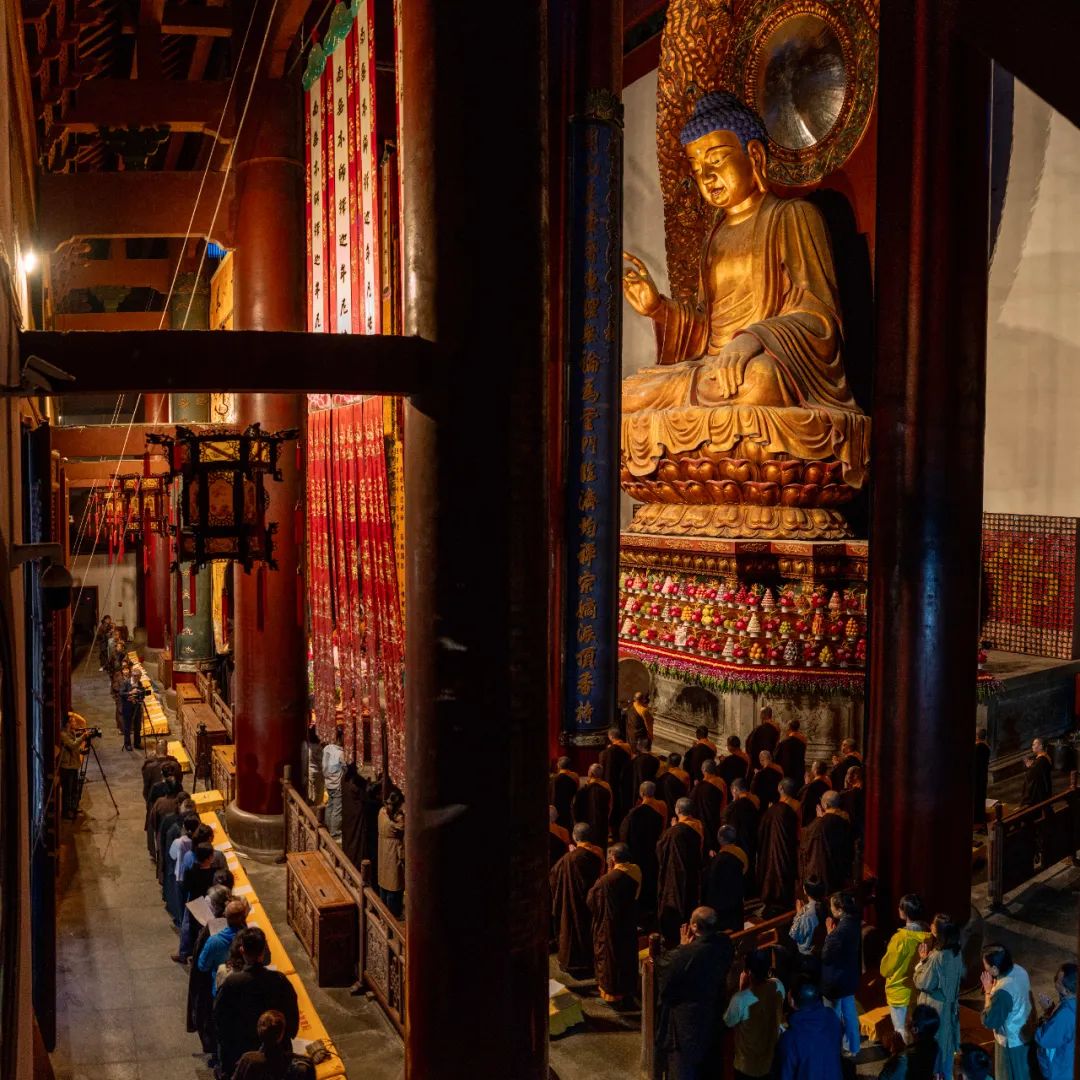 大雄宝殿内经声佛号,梵唱清扬,四众弟子同心感念本师释迦牟尼佛慈航倒驾,降迹娑婆;不恋王宫富贵,直趣雪岭修行,十九学道出家,三十降魔成佛;演经至五千余卷,住世于八十多年,开三乘方便之门,导七趣菩提之路……大众至诚称念“南无本师释迦牟尼佛”圣号,灵隐寺监院智光法师用小勺舀香汤三勺灌沐太子金身,而后大众分班依次浴佛,共祈国运昌隆,正法久住,法界众生永离烦恼尘垢、速证清净法身!