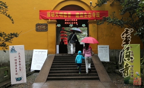 悬挂在灵隐寺进口处"推动文明敬香,建设生态寺院"和大雄宝殿左右两侧的"恭敬礼佛,文明敬香""三炷清香,文明礼佛"横幅,显得十分醒目。来灵隐寺进香的信众和游客正在有序、文明地敬香……