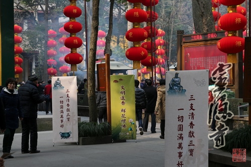 1、在寺院进口、十方苑和大雄宝殿都设置了宣传文明敬香的横幅,"推动文明敬香,建设生态寺院"、"三炷清香,一片诚心"等温馨提示。