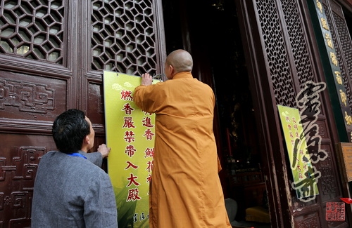 为了寺院的清净安宁,为了共同的蓝天,为了您和他人的健康吉祥,敬请广大游客、香客积极配合,自觉遵守,为共同倡导文明敬香,推进生态文明发展,建设美丽杭州作出积极的贡献。
