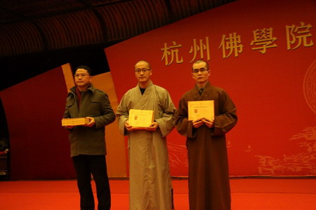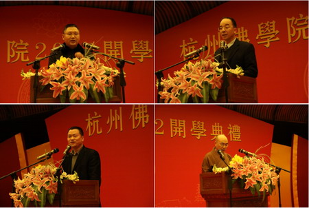 在庄严的三宝歌中,杭州佛学院2012开学典礼正式开始。杭州佛学院常务副院长刚晓法师作2011年工作总结,杭州佛学院院长、灵隐寺方丈光泉大和尚为全体学员作重要开示。杭州 市民族宗教事务局副局长吴建华、杭州电子科技大学党委书记费君清,浙江省民族宗教委员会副主任陈振华也在会议上作了重要讲话。学僧宗淼法师代表毕业生发言,感谢佛学院的培养和教育。最后由佛学院主要领导为毕业生、优秀学员、先进工作者、本年度聘用者颁发证书。