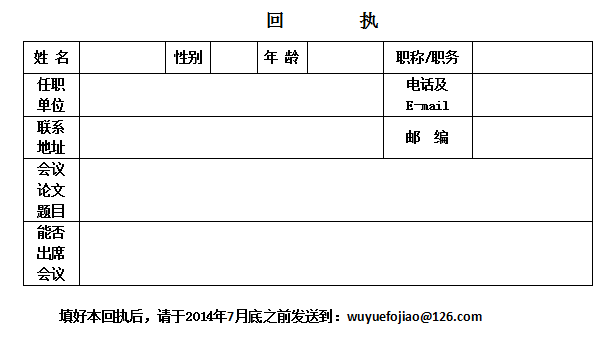 六、请您务必在2014年7月底之前将,将与会回执表,发送到wuyuefojiao@126.com,论文的提交时间为11月10日之前。组委会将对你的回执与论文进行审查,确认你的论文水平与会议主题相合以后,将于11月中旬发出正式代表邀请函。