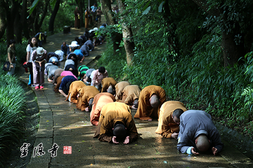 在这群特殊的朝圣队伍中,有位丝丝白发、深受腰椎间盘痛苦折磨的居士,平时就腿脚不便,问她为何能够坚持住3个小时的三步一拜。她说:今天有如此殊胜的因缘,能跟随在光泉大和尚率领的朝圣法师队伍身后,法师们身教胜于言教,同修们的精进不懈也于无形中给予自己很大的力量,在这样的氛围里,自己岂甘落后……