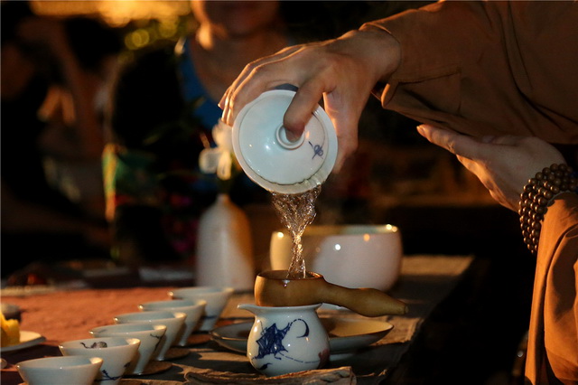 只是,真的是一片寂静无声吗?仔细听!幽幽水声细若游丝,一滴滴地敲打着。顷刻,又有清雅笛声响起,宛如天籁。声音自大雄宝殿前的广场而来,细看,数十桌茶席次第摆开,每桌一茶师,六茶客,大概有近两百人吧,可是,丝毫没有鼎沸人声,连悄然私语都是极少的。茶人们敛声屏气,神情专注,温杯、洗茶、冲泡、奉茶,一举一动,细致谨慎,却又如行云流水。茶客细嗅茶香,默品佳茗。一时间,对坐无言,只有泡茶注水时发出的咕咕响声,为这个特别的夜晚,带来不少趣味。