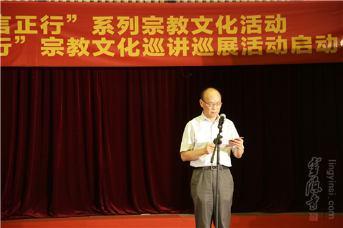 7月29日下午,浙江"寻梦中国•正言正行"宗教文化巡讲巡展活动暨杭州"服务峰会·正言正行"系列文化活动在杭州佛学院拉开帷幕。浙江省民族宗教事务委员会副主任倪忠扬、杭州市民族宗教事务局党组副书记、副局长唐明壮等人出席启动仪式。市各宗教团体、基督教青年会、基督教女青年会秘书长以上班子成员、各市属宗教活动场所主要负责人、佛学院学生、居士等近300人共同参加了启动仪式。倪忠扬副主任、唐明壮副局长在启动仪式上致辞。市佛教协会会长光泉法师主持。