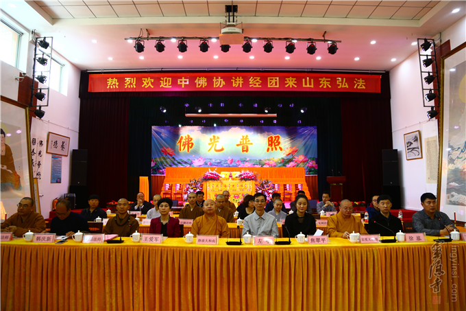 中国佛教协会副会长静波法师、副秘书长宏度法师、教务科科长妙航法师;山东省宗教局副局长左亭、省委统战部六处处长韩庆新,淄博市委统战部副部长、民宗局局长王爱军,淄川区委统战部部长焦翠平、民宗局长史涛;山东省佛教协会会长仁昌法师及省、市、区(县)佛协负责法师等出席活动。丁忠越、仁昌法师和宏度法师分别代表当地政府部门、佛协和中国佛教协会巡回讲经团先后致辞,山东省佛协副会长本悟法师、心见法师主持讲经法会。