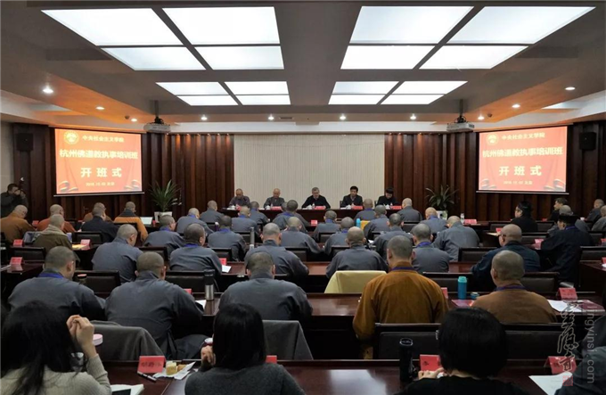 2018年12月2日上午,杭州佛道教执事培训班在中央社会主义学院举行开班仪式。中央社会主义学院党组成员、副院长袁莎,杭州市民族宗教事务局党组成员、巡视员王德好,中国佛教协会副秘书长、杭州市佛教协会会长光泉法师,杭州市道教协会会长董中基道长先后在开班仪式上致辞。开班仪式由杭州佛学院副院长觉恒法师主持。来自杭州市佛教寺院、道教寺观的执事代表和杭州市区县佛教协会、道教协会代表80余人参加本次活动。