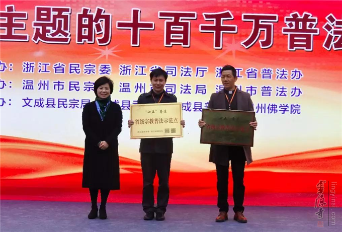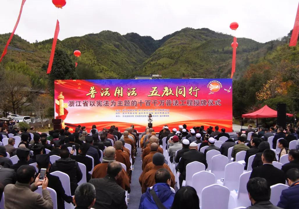12月7日上午,作为我省首个"宪法宣传周"活动的重头戏,普法用法·五教同行——浙江省以宪法为主题的"十百千万"普法工程授牌仪式在温州文成隆重举行。省委统战部副部长、省民宗委主任楼炳文出席活动并讲话,温州市委常委、统战部长施艾珠致辞,《中国宗教》杂志社社长刘金光,省民宗委副主任陈振华,省司法厅副厅长、省普法办主任劳泓等出席活动。全省民宗、普法系统干部,宗教界人士和信教群众代表共300多人参加活动。