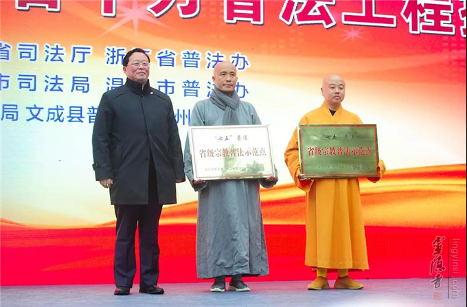 授牌仪式在庄严的升国旗环节中拉开帷幕。有关领导为14处省级宗教普法示范点一一授牌。授牌仪式上,楼炳文强调:
