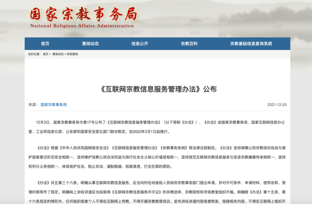 12月3日,国家宗教事务局令第17号公布了《互联网宗教信息服务管理办法》(以下简称《办法》),《办法》由国家宗教事务局、国家互联网信息办公室、工业和信息化部、公安部和国家安全部五部门联合制定,自2022年3月1日起施行。
