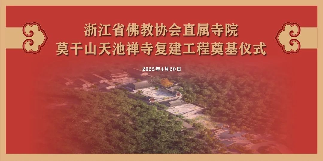 2022年4月20日上午,浙江省佛教协会直属寺院——莫干山天池禅寺举行复建工程奠基仪式。浙江省机关事务管理局、浙江省民宗委、浙江省佛教协会等有关领导,莫干山管理局、莫干山文旅集团、德清县有关负责人参加仪式。浙江省佛教协会会长光泉法师致欢迎词并介绍项目情况,浙江省民宗委副主任钟新章、浙江省机关事务管理局副局长刘文波分别致辞,向复建工程表示祝贺。随后,与会领导嘉宾共同为莫干山天池禅寺复建工程项目揭牌并培土奠基。