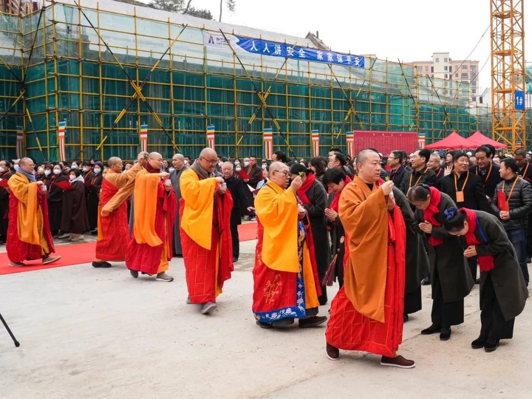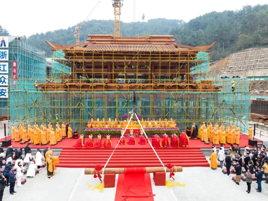 2月23日,淳安龙华禅寺施工现场举行圆通宝殿上梁法会。法会于上午9时30分正式开始,浙江省佛教协会会长、灵隐寺方丈光泉法师等11位主法法师手持杨枝甘露,绕场洒净,并宣说上梁法语。