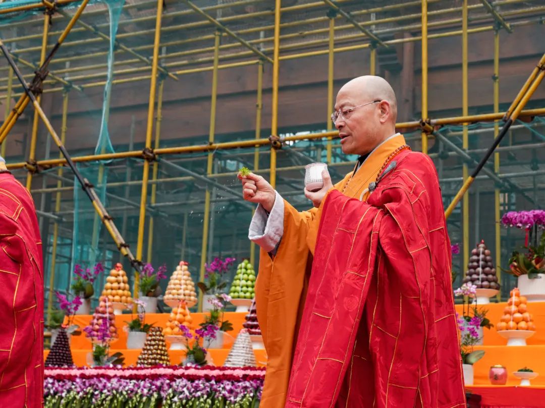 ▲主法法师持杨枝净水遍洒法会现场