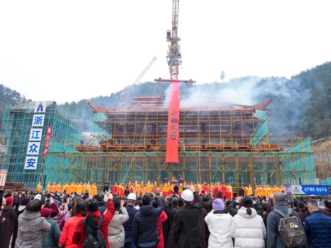 “金梁高立如山耸,龙象辈出法界弘。今仗菩萨神威力,光前裕后绍先宗。升!”光泉法师宣说上梁法语后,伴随着嘹亮的梵唱,主梁缓缓升起,与会大众欢喜赞叹,共同礼佛、回向。法会现场梵音嘹亮,清净庄严,以此上梁因缘,祝祷社会和谐、人民安乐,佛日增辉、法轮常转;龙华禅寺法运昌隆,护法莲侣福慧增长;更祈愿与会嘉宾、居士六时吉祥,万事胜意。