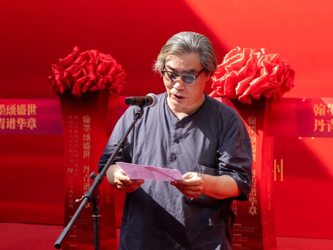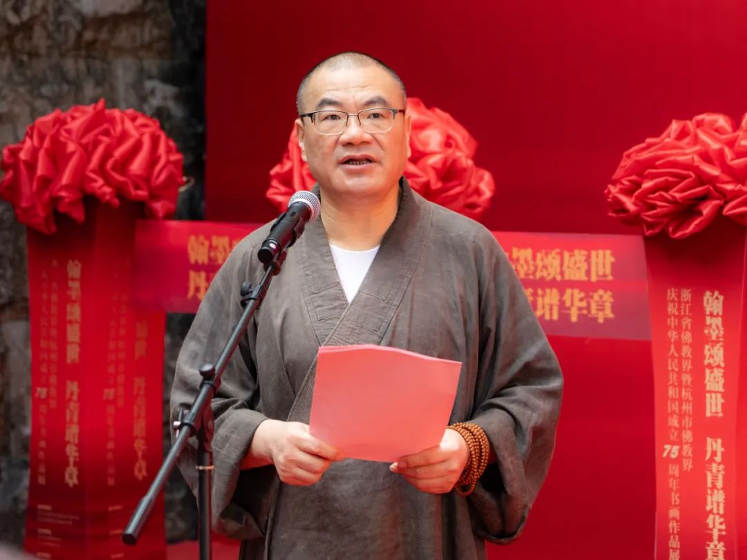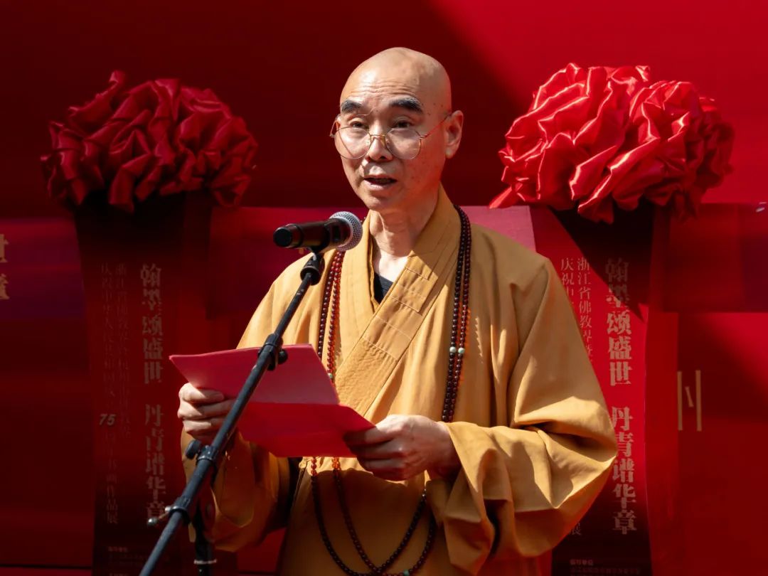 浙江省民宗委副主任、一级巡视员陈振华,中国美术学院书法学院院长陈忠康,杭州市民宗局副局长陶胜,浙江省佛教协会副会长诚信法师,浙江省佛教协会副会长、杭州市佛教协会会长月真法师,华东师范大学美术学院书法系主任张索,浙江书法院副教授林峰,华东师范大学美术学院副教授、中国美术学院书法学院硕士研究生导师王客,杭州市佛协副会长智圆法师、戒清法师、念顺法师、圆诠法师、秘书长胡胜军、常务副秘书长邓安松以及杭州市属寺院、杭州佛学院代表,华东师范大学、中国美术学院、西泠印社等单位艺术家代表100余人参加开幕仪式。开幕仪式由月真法师主持。▲浙江省佛教协会副会长、杭州市佛教协会会长月真法师主持开幕式陈忠康在致辞中指出,此次书画艺术展览的作品,涵盖了书法、绘画、篆刻等多种形式,主题鲜明、内涵丰富,是一场艺术的盛宴,也是一次深刻的文化对话。佛教界、艺术界、文化界等高僧大德和艺术家们,将佛教思想与时代社会相结合,以笔墨传递智慧和慈悲,用艺术作品描绘心中的信仰,和对祖国、中国共产党和中国特色社会主义的热爱。诚信法师在致辞中指出,近年来,浙江省暨杭州市佛教界努力践行文化润教理念,通过打造文化品牌、设立文化机构、开展文化活动等方式夯实文化自信。他希望,一是要坚持中国化方向。要自觉把社会主义核心价值观、中华优秀传统文化融入到佛教的思想、组织、文化等各项建设中,积极引导佛教与社会主义社会相适应。二是要加强人才培养。要引领佛教界实施中华优秀传统文化学习教育工程,持续培养精通佛典教义、精通中华优秀传统文化的“双通”人才。三是要发挥积极作用。要发挥好佛教净化心灵、涵育道德、启迪智慧的教化功能,大力弘扬佛教“慈悲济世、利乐有情”的优良传统,积极投身公益慈善事业,不断向社会释放和传递佛教正能量。随后,陈振华宣布“翰墨颂盛世,丹青谱华章”浙江省佛教界暨杭州市佛教界庆祝新中国成立75周年书画展正式开幕。此次书画展旨在庆祝中华人民共和国成立七十五周年,全面展示浙江省和杭州市佛教界在坚持佛教中国化方向,与社会主义社会相适应等方面所取得的积极成果,彰显新时代佛教新气象、新面貌。书画展精选了全省各地佛教界、杭州市各区县佛协、市属各寺院、杭州佛学院及中国美院、西泠印社等书画艺术界人士的作品200余幅,作品包含书法、篆刻、绘画等中国传统文化艺术,大家以翰墨书写爱国情怀、以丹青绘就时代新貌,向祖国七十五周年华诞献礼。