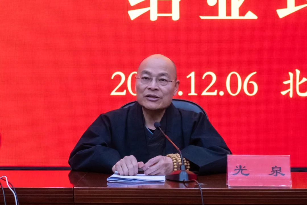12月6日下午,浙江省重点寺院执事培训班暨2024年浙江省佛教教职人员省级轮训第二期培训班在中央社会主义学院(北京)结业。浙江省佛教协会会长光泉法师出席结业式并讲话。光泉法师在讲话中向这次培训班的授课老师,向浙江省、杭州市佛协以及灵隐寺的工作团队,向来自全省各地的重点寺院执事表示衷心感谢。光泉法师指出,佛教作为中华优秀传统文化的重要组成部分,承载着深厚的历史底蕴和精神内涵,对社会的和谐稳定、人们心灵的滋养启迪,始终发挥着重要作用。希望大家回去后,要学以致用,拓宽视野,提高站位,从宏观层面认识世界的发展趋势以及我国所处的历史方位,明晰佛教在当前时代背景下所面临的机遇与挑战,引导信众正信正行,积极融入并服务社会,使佛教真正成为助力经济社会发展、增进人民福祉的正能量。本次培训班为期5天。课程围绕新时代宗教的发展态势、理论内涵与交流互鉴等方面展开。培训班积极引领学员参与到党的创新理论学习与实践中来,共同助力佛教事业的健康发展,对于提升政治觉悟、推动佛教中国化进程、促进佛教与社会的和谐共融等方面都具有重要意义。