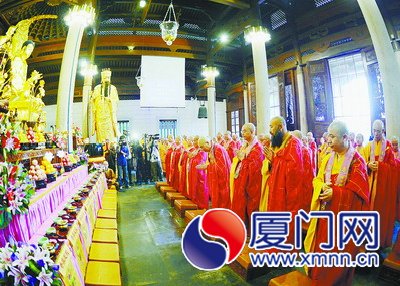 2013年6月14日,参加"第五届海峡论坛·闽台佛教教育交流研讨会"的两岸300余名高僧,在南普陀寺参加了两岸和平祈福法会。