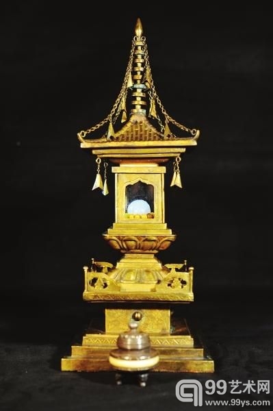 北京朔源文物鉴定中心主任荣宏君介绍,上海嘉泰拍卖公司即将举行的春拍上,铜鎏金舍利供塔,连同舍利一起拍卖。塔中供养的是一颗大如鸽卵的舍利,洁白温润似玉,瑞光内蕴,极为罕见。根据拍卖会图录介绍称,舍利塔为十八世纪鎏金錾花古塔、蜜蜡珠环、舍利、银蜜珠如意纹三足炉熏(内存藏红花)组套,估价10万元至15万元之间。