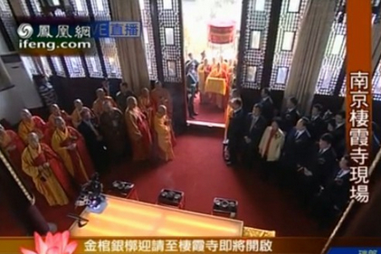 9时19分,108位高僧拈香供佛。中国佛协会长传印长老、台湾佛光山星云大师、澳门佛教总会理事长健钊大师等两岸三地的108位高僧大德齐集栖霞寺,为迎请"佛顶真骨"舍利举行盛大开启、开光法会。法会结束后,主法的三位高僧将塔中供奉的佛顶真骨和感应舍利请出,随即移至特制的恒温恒湿密封盒里保存,并将在栖霞寺法堂供奉一个月。