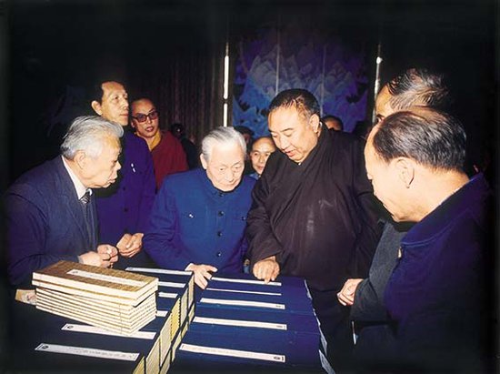7月18日、21日,为庆祝西藏和平解放50周年,以国家副主席胡锦涛为团长的中央代表团参观了拉萨大昭寺、日喀则扎什伦布寺,并向寺院赠送《大藏经》,向僧众发放布施。(见图)