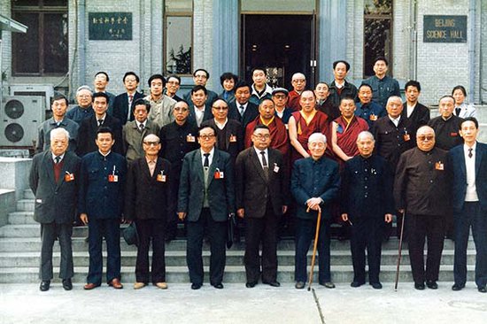 12月16日至23日,中国佛教协会举行第四届全国代表会议,出席会议的有来自全国29个省、自治区、直辖市包括汉、藏、蒙古、傣、满、裕固、纳西等民族的代表254人。会议通过了赵朴初作的《中国佛教协会第三届理事会工作报告》,修改了《中国佛教协会章程》,选出新的理事会和领导成员。班禅额尔德尼·确吉坚赞为名誉会长,赵朴初为会长。(图为全国人大常委会副委员长乌兰夫、阿沛·阿旺普美、第十世班禅额尔德尼·确吉坚赞会见全体代表)
