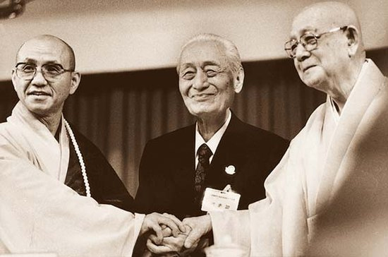 9月26日,中国佛教协会会长赵朴初赴日本参加纪念日中佛教友好交流暨庆祝中国佛教协会成立40周年大会。在这次大会上,赵朴初会长首次提出中韩日三国佛教"黄金纽带"关系构想,得到韩国和日本佛教界的积极响应。(图为赵朴初与中韩佛教领袖在一起)