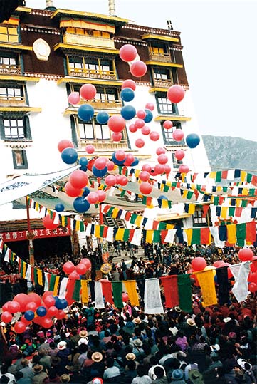 8月9日,西藏拉萨布达拉宫维修工程胜利竣工,各族各界群众举行庆典庆祝。(见图)