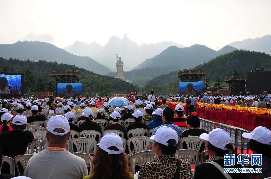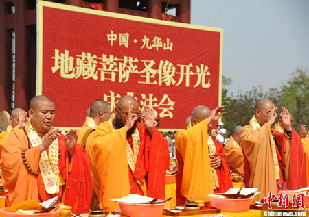 备受社会各界关注的九华山99米地藏菩萨露天大铜像,于2013年8月31日上午在九华山大愿文化园举行圣像开光庆典法会。据了解,圣像开光庆典法会由九 华山佛教协会举办。有来自世界各地的99位大德高僧参加法会。圣像开光庆典是九华山佛教史上的一次盛大法会,是九华山佛门以及风景区人民的一次大喜事。