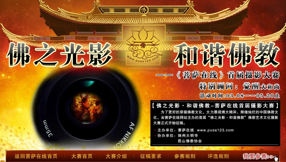 为了更好的传承和弘扬丰富多彩、辉煌灿烂的中国佛教文化,展示当代佛教欣欣向荣、紧跟时代步伐的积极形象。菩萨在线网站特主办首届"佛之光影-和谐佛教"佛教艺术文化摄影大赛。此次摄影大赛得到了扬州大明寺、昆山佛教协会的大力支持,中国佛教协会多位副会长还应邀担任此次活动的特别顾问和评委。