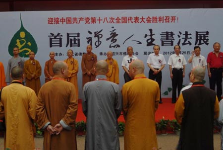 为迎接党的十八大胜利召开,由浙江省佛教协会主办,绍兴市佛教协会承办的首届"禅意人生"书法展,于2012年8月25日上午在绍兴博物馆隆重开 幕。中国佛教协会咨议委员会副主席、江苏省佛教协会名誉会长、常州天宁寺方丈松纯长老;中国佛教协会副秘书长宗家顺;浙江省佛教协会会长、宁波雪窦寺方丈 怡藏法师及社会各界人士约200余人参加开幕式。浙江省民宗委副主任倪忠扬出席开幕式并讲话。