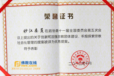 2012年10月12日,在政协第十一届全国委员会优秀提案和先进承办单位表彰会上,全国政协委员、中国佛教协会副会长、山西省佛教协会会长妙江法师的《关于创新和加强宗教团体建设,积极探索宗教社会化管理》的提案在诸多委员提案中脱颖而出,被评为优秀提案。