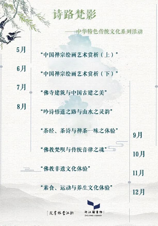 浙江云林书院与浙江图书馆2021年联合推出“诗路梵影—中华特色传统文化系列活动”。本系列活动涵盖禅宗书画、诗僧梵韵、梵呗音乐、佛寺古建、禅茶文化、非遗传承、素食、运动与养生文化体验等主题,以专家讲座为主、结合文化沙龙、实地走读、参与体验等形式,旨在全方位、多角度挖掘佛教文化的中国化、本土化传统特色,展现佛教文化的当代价值。