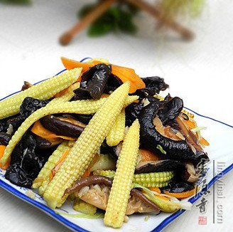 5、放入香菇,翻炒几下 , 放入玉米笋、胡萝卜片和黑木耳。