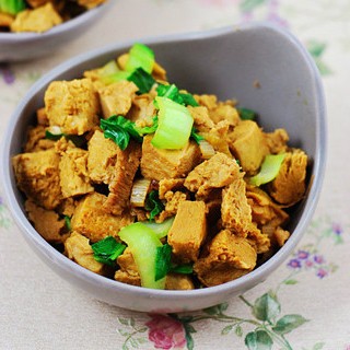 【主料】:冻豆腐2块辅料、油菜适量调料、色拉油适量、食盐4克、酱油5克、素味精2克、白糖2克